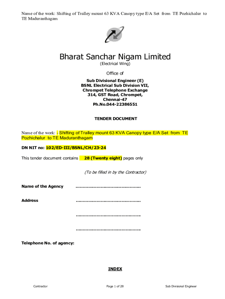 Name of the work: Shifting of Tralley mount 63 KVA Canopy type E/A Set from TE Pozhichalur to TE MaduranthagamBharat Sanchar Nigam Limited (Electrical Wing)Office of Sub Divisional Engineer (E) BSNL