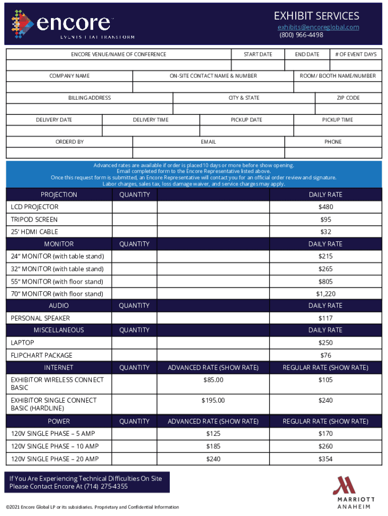 EXHIBIT SERVICES exhibits@encoreglobal.com (800) 9664498 ENCORE VENUE/NAME OF CONFERENCESTART DATECOMPANY NAMEONSITE CONTACT NAME & NUMBERBILLING ADDRESSDELIVERY DATEEND DATE# OF EVENT DAYSROOM/ BOOTH