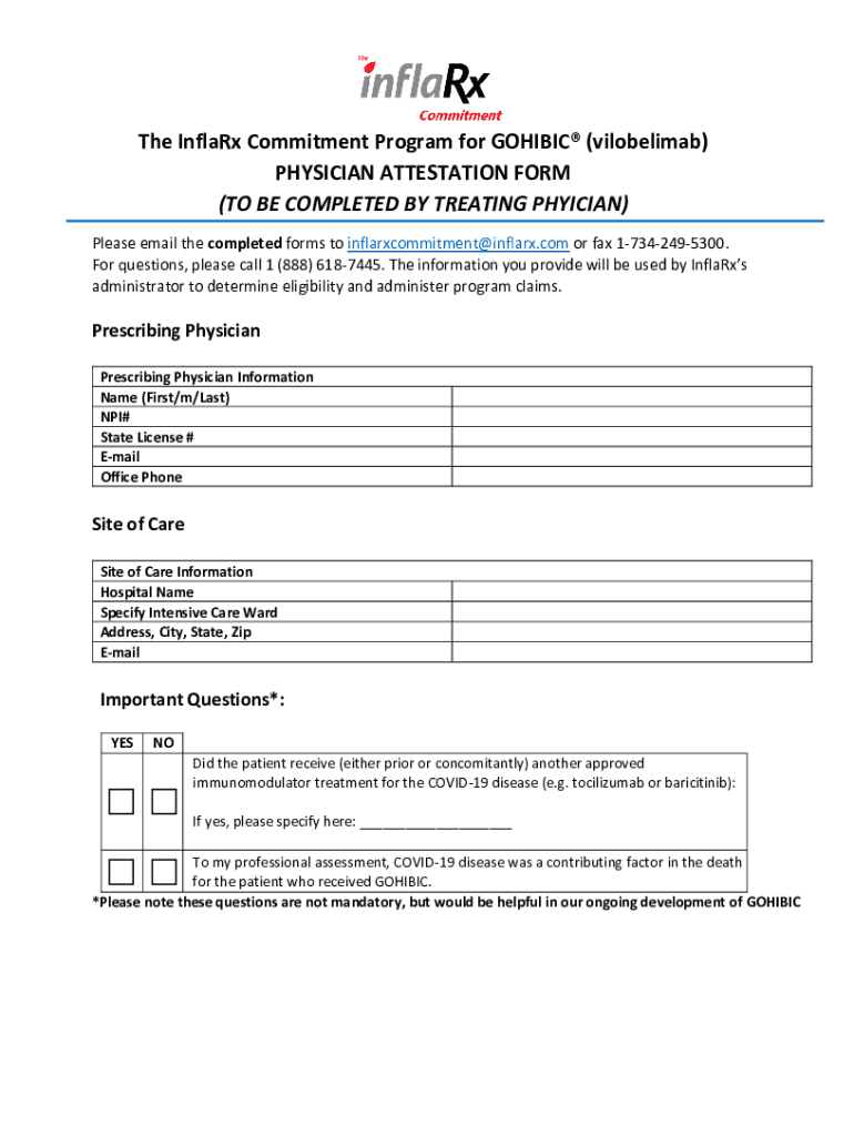 The InflaRx Commitment Program for GOHIBIC (vilobelimab) PHYSICIAN ATTESTATION FORM (TO BE COMPLETED BY TREATING PHYICIAN) Please email the completed forms to inflarxcommitment@inflarx.com or fax