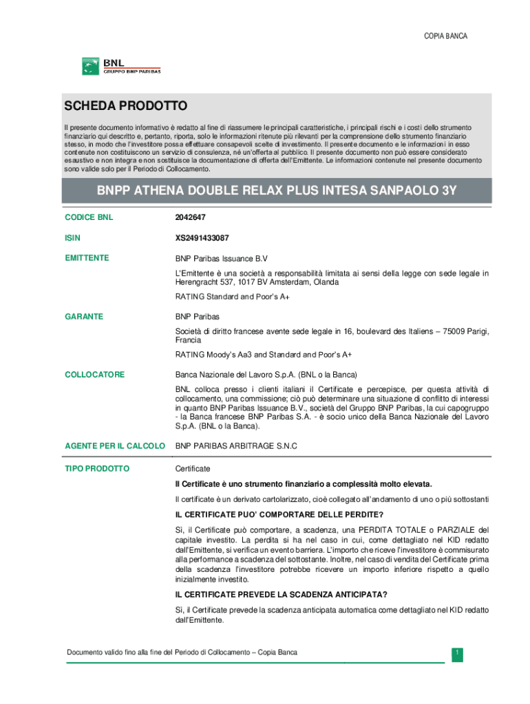Ottieni il gratuito BNPP ATHENA DOUBLE RELAX PLUS INTESA SANPAOLO 3Y