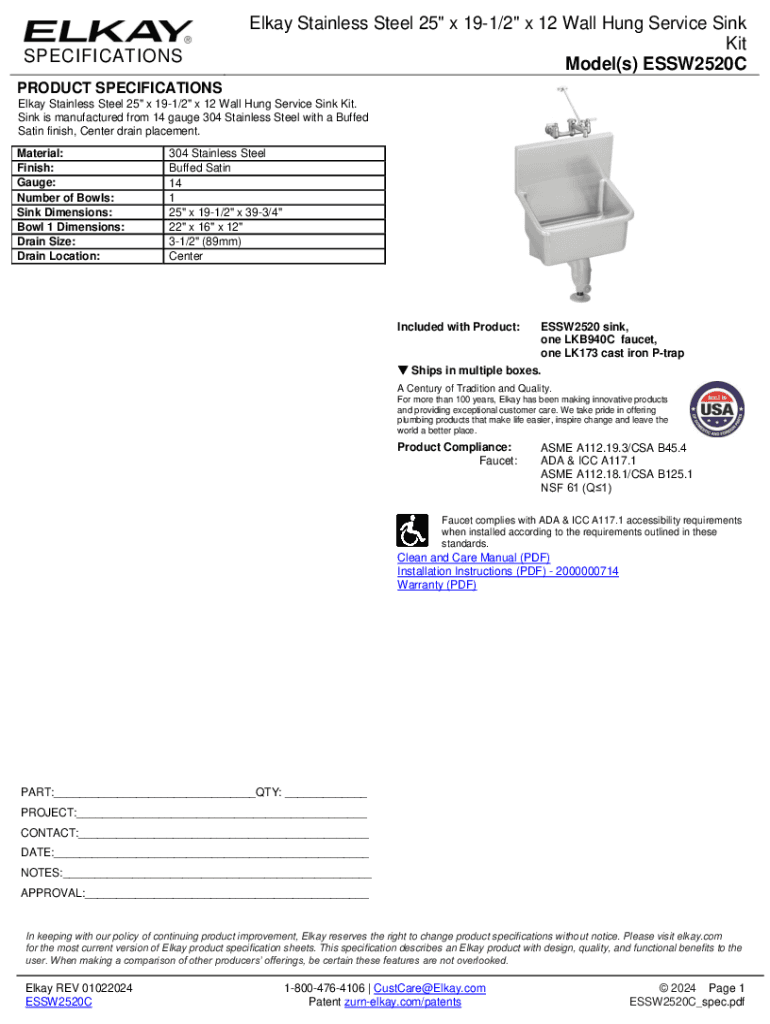 SPECIFICATIONSElkay Stainless Steel 25\" x 191/2\" x 12 Wall Hung Service Sink Kit Model(s) ESSW2520CPRODUCT SPECIFICATIONS Elkay Stainless Steel 25\" x 191/2\" x 12 Wall Hung Service Sink Kit. Sink