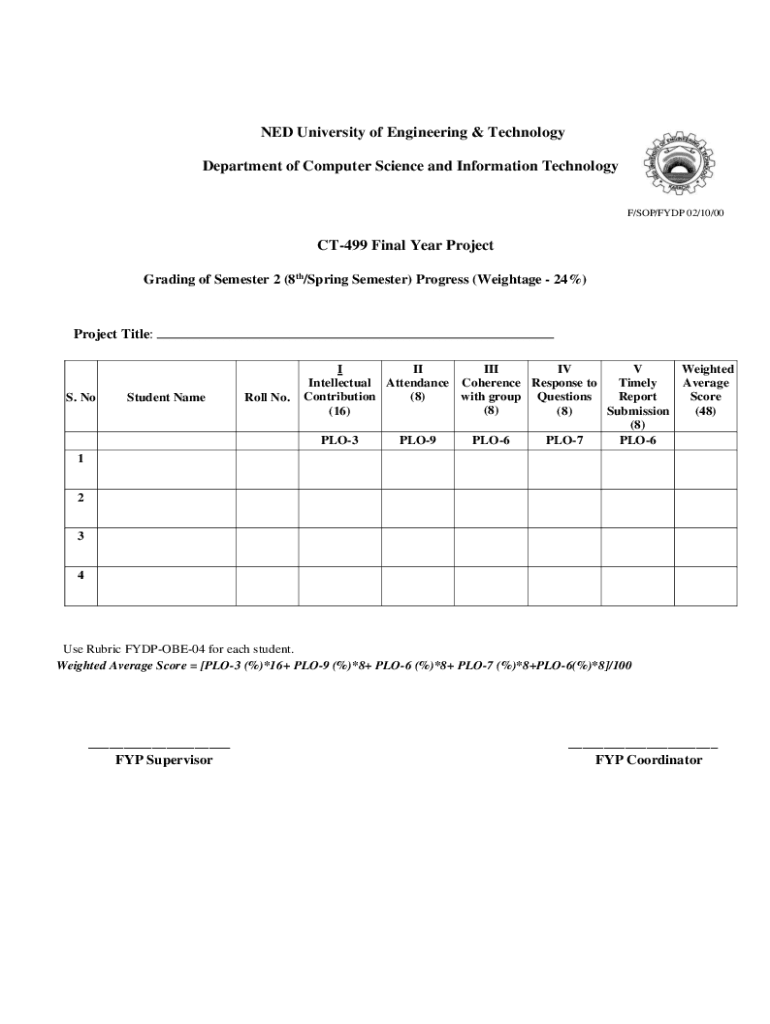 NED University of Engineering & Technology Department of Computer Science and Information Technology F/SOP/FYDP 02/10/00CT499 Final Year Project Grading of Semester 2 (8th/Spring Semester) Progress