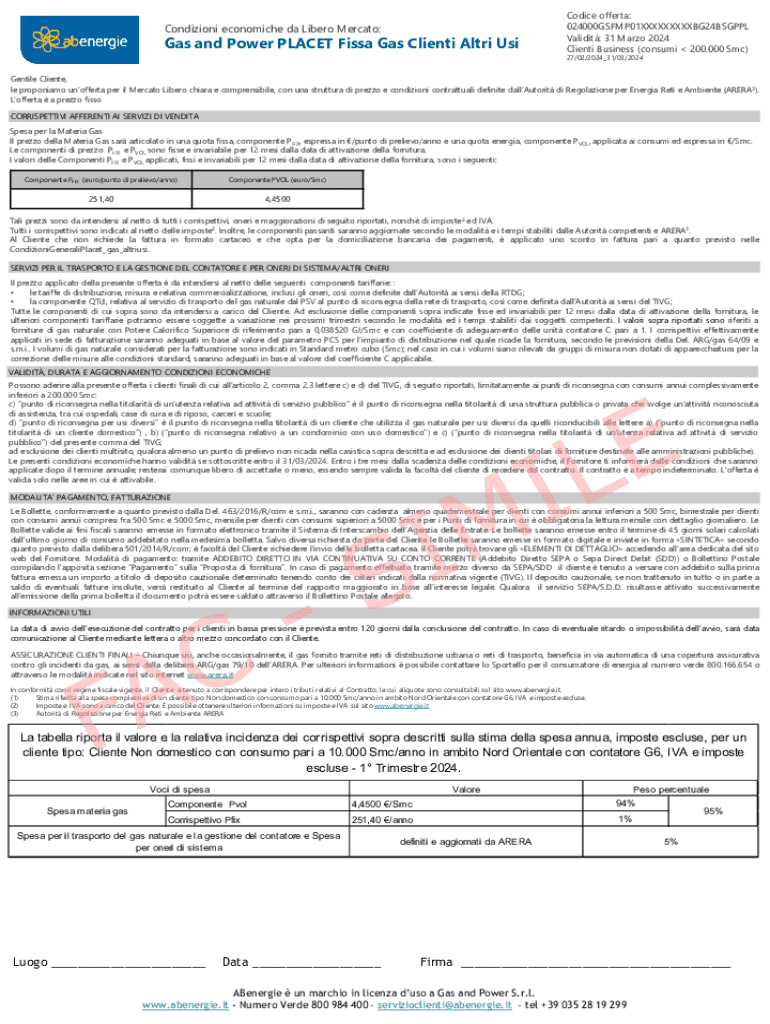 Condizioni economiche da Libero Mercato:Gas and Power PLACET Fissa Gas Clienti Altri UsiCodice offerta: 024000GSFMP01XXXXXXXXXBG24BSGPPL Validit: 31 Marzo 2024 Clienti Business (consumi 200.000 Smc)
