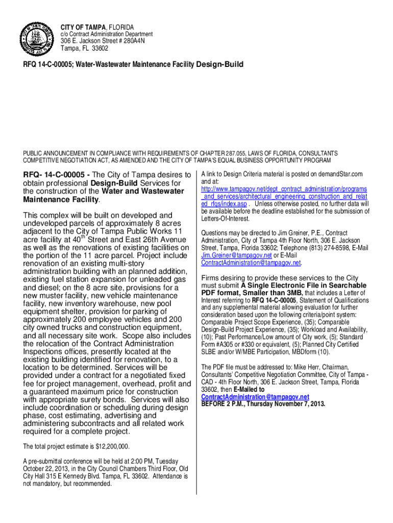 CITY OF TAMPA, FLORIDAc/o Contract Administration Department306 E. Jackson Street # 280A4N Tampa, FL 33602RFQ 14C00005; WaterWastewater Maintenance Facility DesignBuildPUBLIC ANNOUNCEMENT IN COMPLIANCE