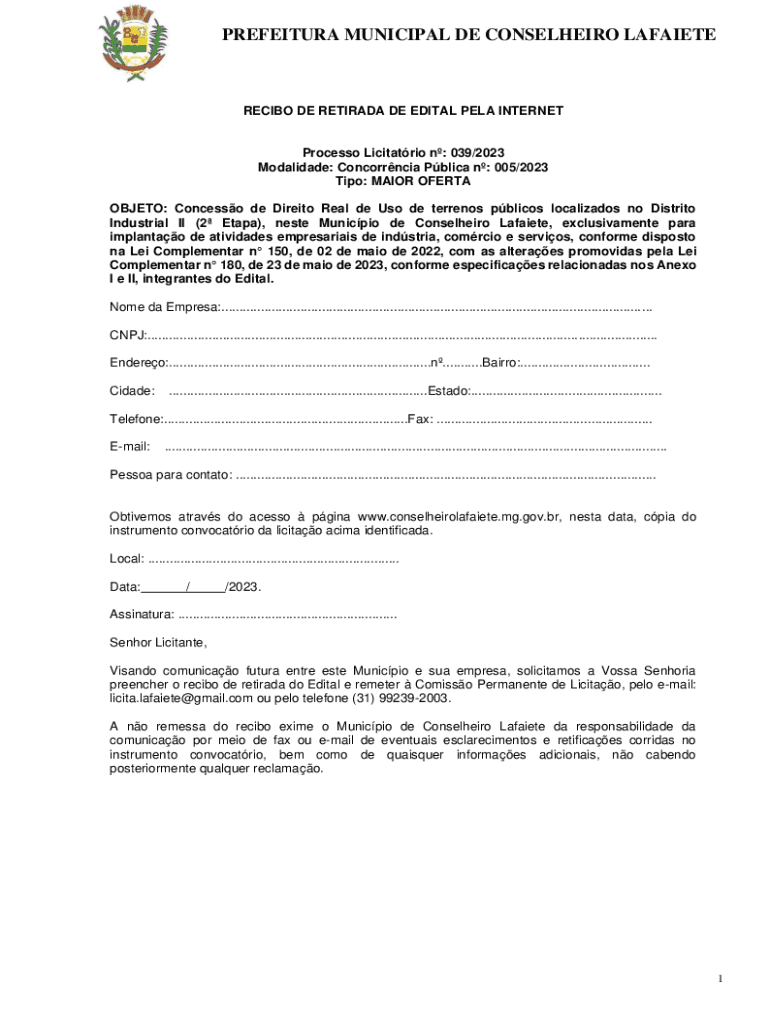 PREFEITURA MUNICIPAL DE CONSELHEIRO LAFAIETERECIBO DE RETIRADA DE EDITAL PELA INTERNETProcesso Licitatrio n: 039/2023 Modalidade: Concorrncia Pblica n: 005/2023 Tipo: MAIOR OFERTA OBJETO: Concesso