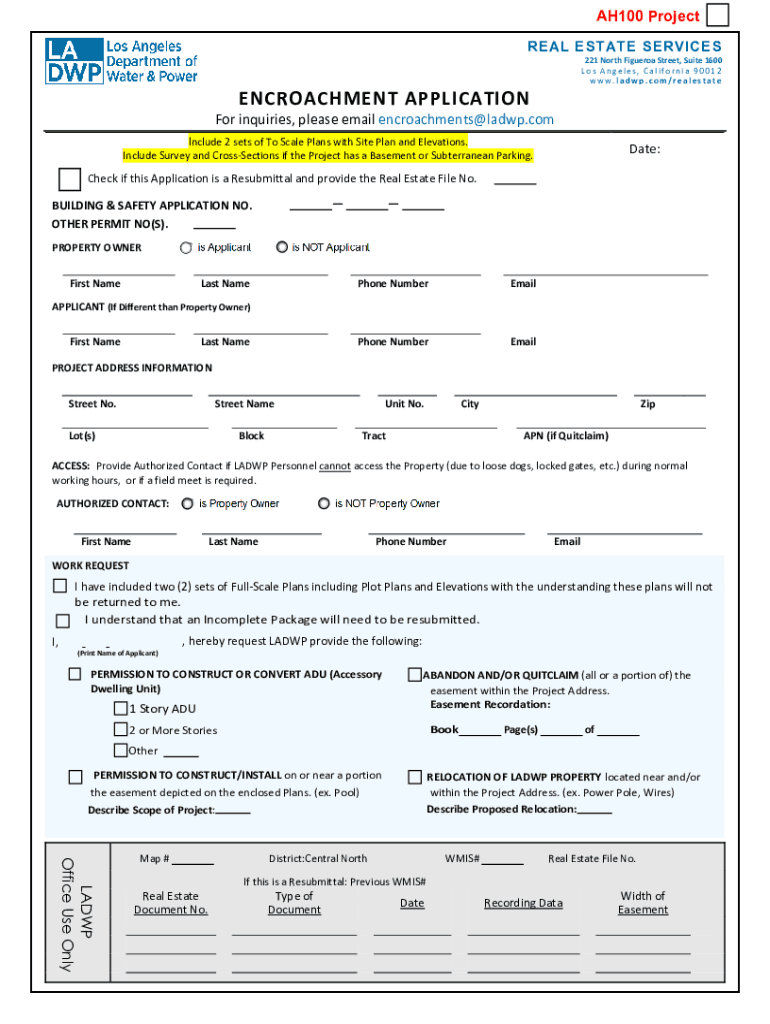 RE AL ESTATE SERVICESENCROACHMENT APPLICATION PROCESS 221 N. Figueroa Street, Suite 1600, Los Angeles, California 90012 (213) 3670562 Inquiries? Please email: encroachments@ladwp.comINSTRUCTIONS TO