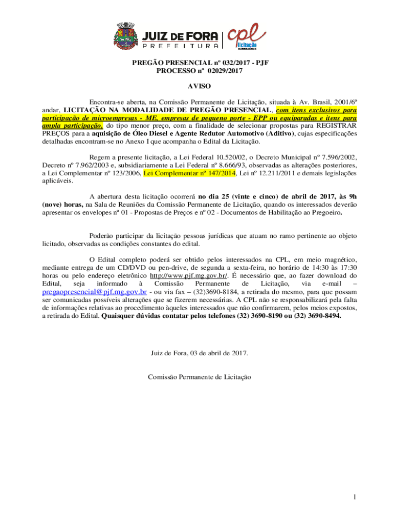 PREGO PRESENCIAL n 032/2017 PJF PROCESSO n 02029/2017 AVISO Encontrase aberta, na Comisso Permanente de Licitao, situada Av. Brasil, 2001/6 andar, LICITAO NA MODALIDADE DE PREGO PRESENCIAL, com itens