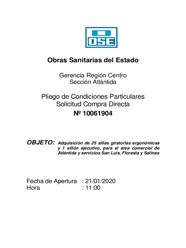 Obras Sanitarias del Estado Gerencia Regin Centro Seccin AtlntidaPliego de Condiciones Particulares Solicitud Compra Directa N 10061904OBJETO:Adquisicin de 25 sillas giratorias ergonmicas y 1 silln