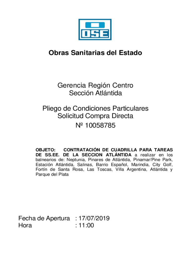 Obras Sanitarias del EstadoGerencia Regin Centro Seccin Atlntida Pliego de Condiciones Particulares Solicitud Compra Directa N 10058785OBJETO: CONTRATACIN DE CUADRILLA PARA TAREAS DE SS.EE. DE LA