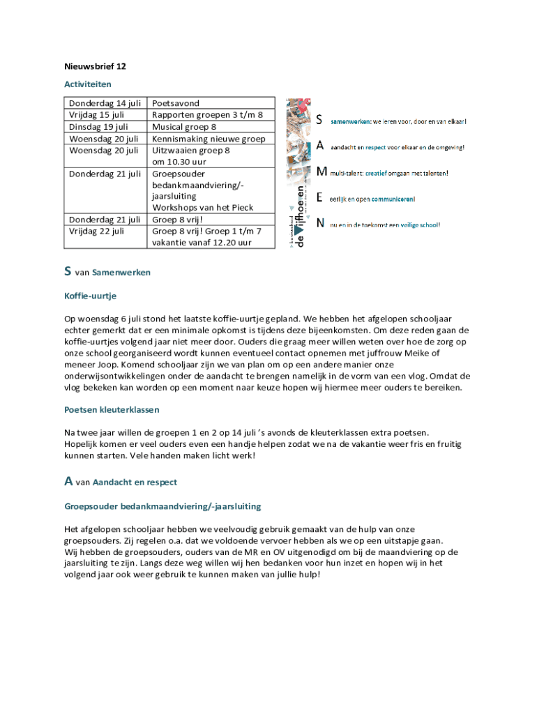 Nieuwsbrief 12 Activiteiten Donderdag 14 juli Vrijdag 15 juli Dinsdag 19 juli Woensdag 20 juli Woensdag 20 juli Donderdag 21 juliDonderdag 21 juli Vrijdag 22 juliSPoetsavond Rapporten groepen 3 t/m