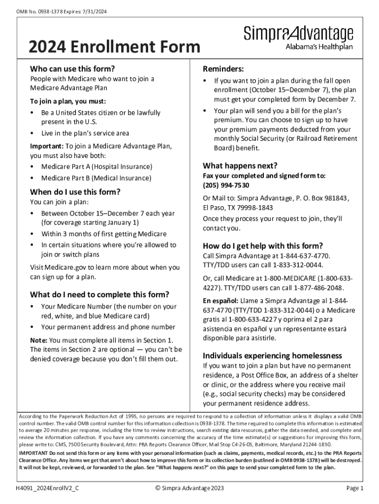 OMB No. 09381378 Expires: 7/31/20242024 Enrollment Form Who can use this form?Reminders:People with Medicare who want to join a Medicare Advantage PlanTo join a plan, you must: Be a United States