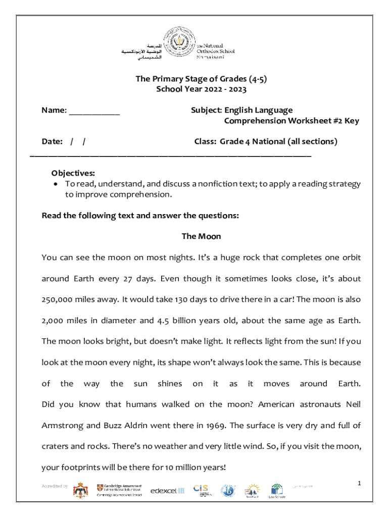 The Primary Stage of Grades (45) School Year 2022 2023 Name: ___Subject: English Language Comprehension Worksheet #2 KeyDate: / / Class: Grade 4 National (all sections) ___ Objectives: To read, understand,