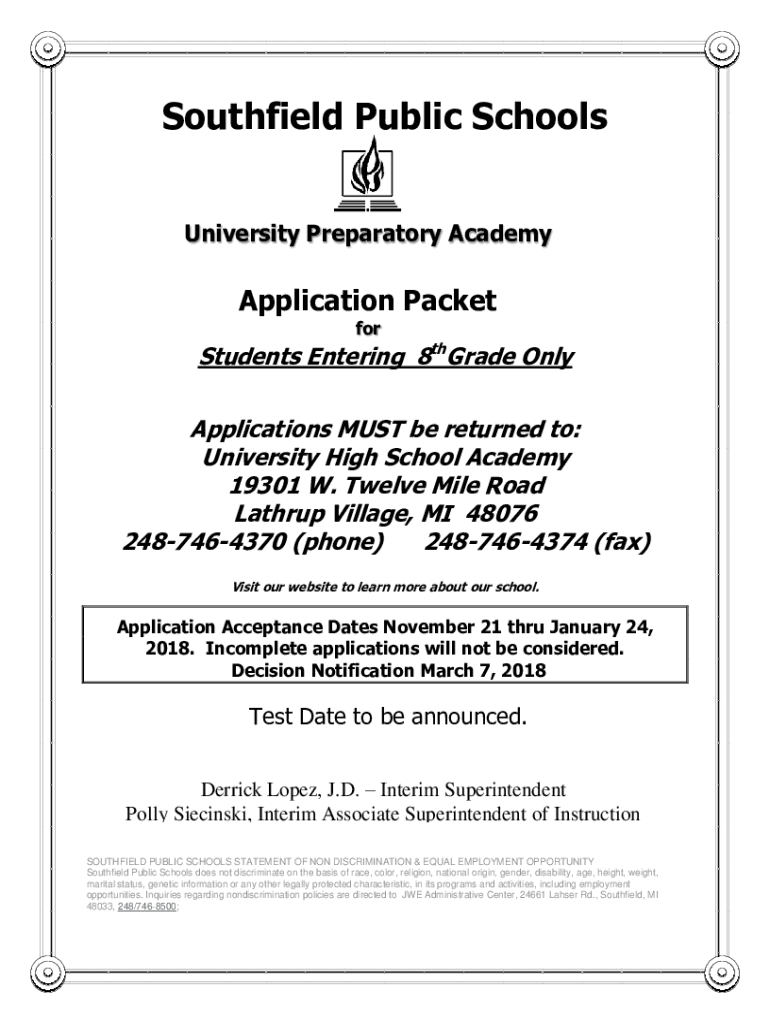 Southfield Public Schools University Preparatory AcademyApplication Packet forStudents Entering 8thGrade Only Applications MUST be returned to: University High School Academy 19301 W. Twelve Mile