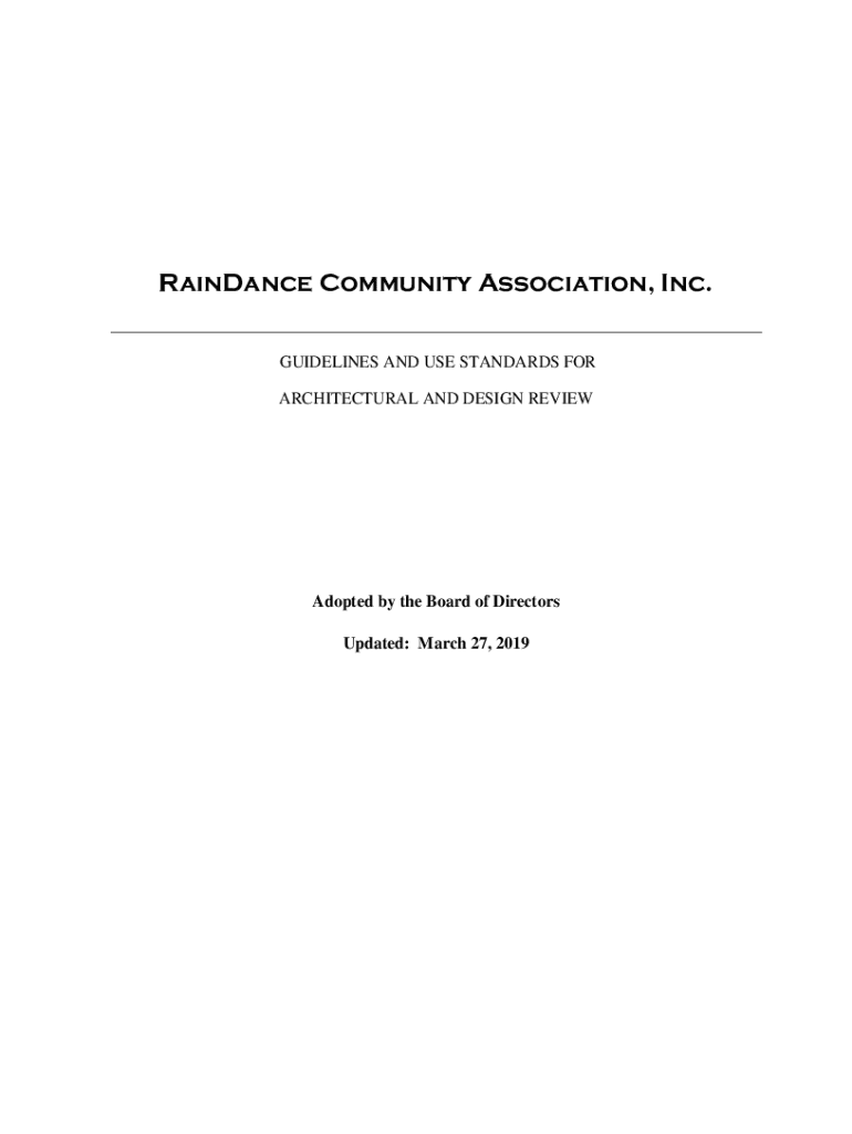 RainDance Community Association, Inc. ___ GUIDELINES AND USE STANDARDS FOR ARCHITECTURAL AND DESIGN REVIEWAdopted by the Board of Directors Updated: March 27, 2019INTRODUCTION DESIGN GUIDELINES. These