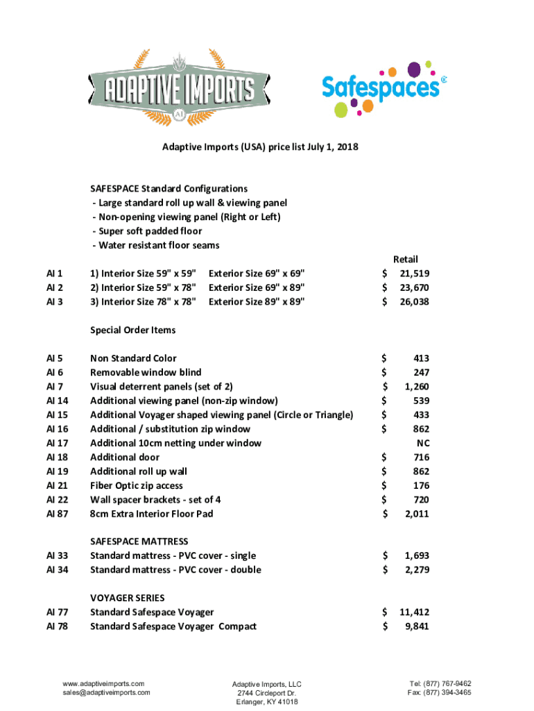 Adaptive Imports (USA) price list July 1, 2018SAFESPACE Standard Configurations Large standard roll up wall & viewing panel Nonopening viewing panel (Right or Left) Super soft padded floor Water resistant