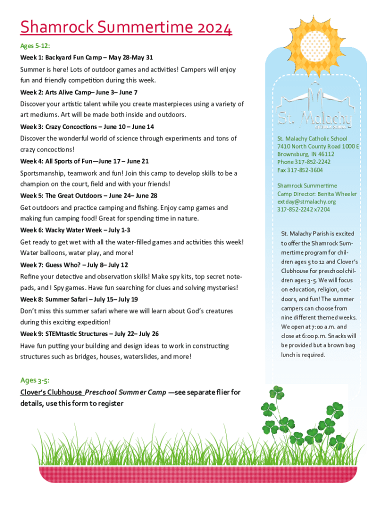 Shamrock Summertime 2024 Ages 512: Week 1: Backyard Fun Camp May 28May 31Summer is here! Lots of outdoor games and activities! Campers will enjoy fun and friendly competition during this week. Week