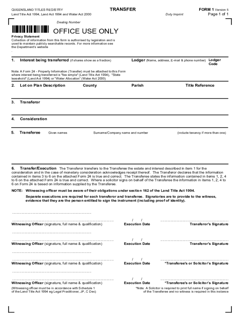 TRANSFERQUEENSLAND TITLES REGISTRY Land Title Act 1994, Land Act 1994 and Water Act 2000FORM 1 Version 5 Page 1 of 1Duty ImprintDealing NumberOFFICE USE ONLY Privacy Statement Collection of information