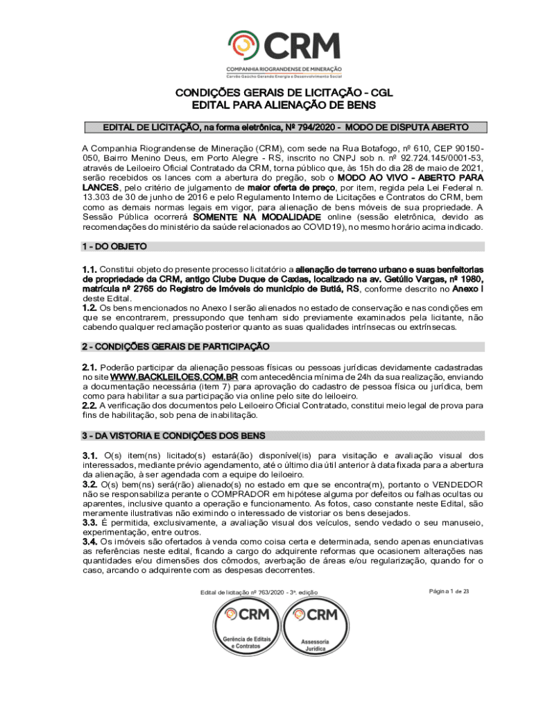 CONDIES GERAIS DE LICITAO CGL EDITAL PARA ALIENAO DE BENS EDITAL DE LICITAO, na forma eletrnica, N 794/2020 MODO DE DISPUTA ABERTO A Companhia Riograndense de Minerao (CRM), com sede na Rua Botafogo,