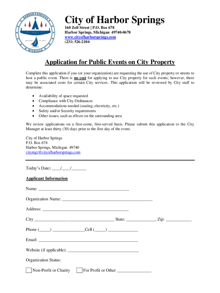City of Harbor Springs 160 Zoll Street | P.O. Box 678 Harbor Springs, Michigan 497400678 www.cityofharborsprings.com (231) 5262104Application for Public Events on City Property Complete this application