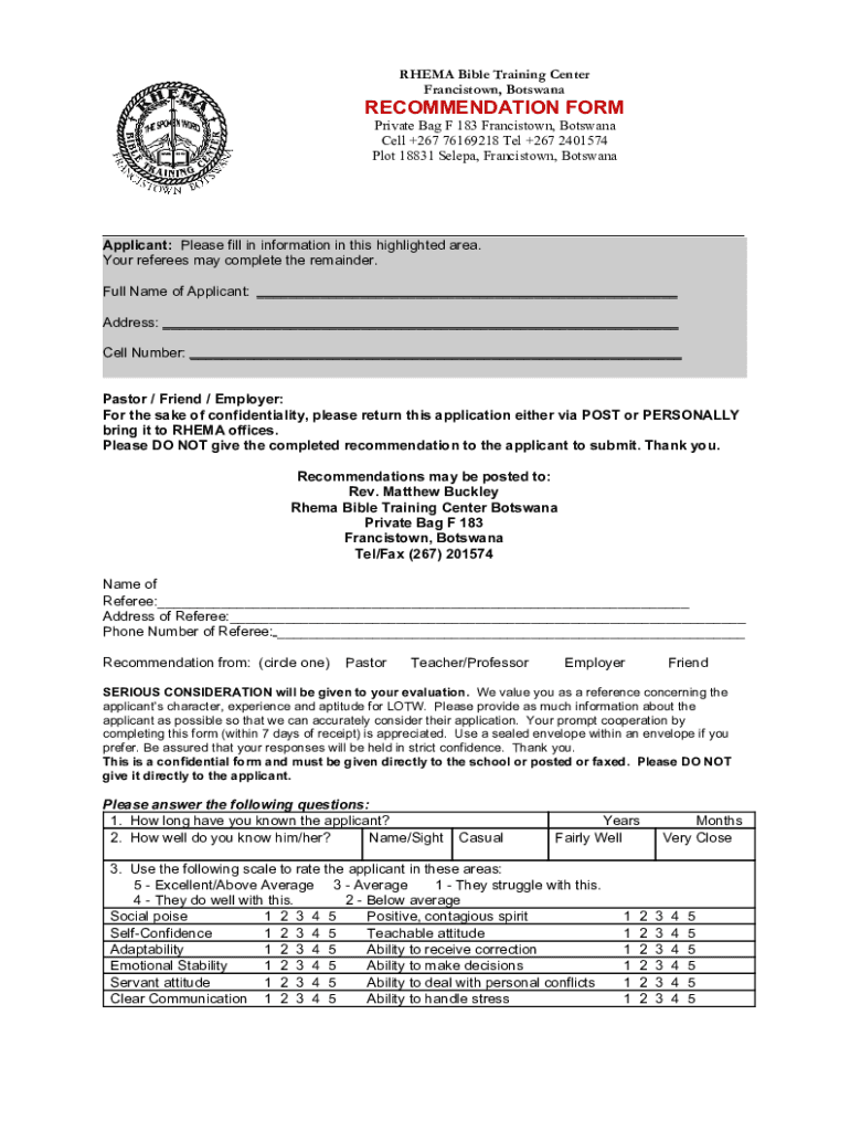 RHEMA Bible Training Center Francistown, BotswanaRECOMMENDATION FORM Private Bag F 183 Francistown, Botswana Cell +267 76169218 Tel +267 2401574 Plot 18831 Selepa, Francistown, Botswana___ Applicant: