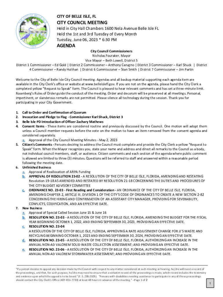 CITY OF BELLE ISLE, FLCITY COUNCIL MEETING Held in City Hall Chambers 1600 Nela Avenue Belle Isle FL Held the 1st and 3rd Tuesday of Every Month Tuesday, June 06, 2023 * 6:30 PMAGENDA City Council