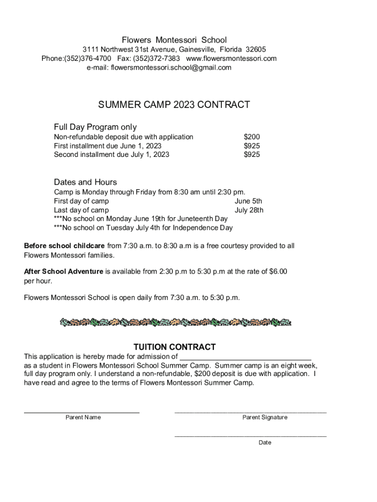 Flowers Montessori School 3111 Northwest 31st Avenue, Gainesville, Florida 32605 Phone:(352)3764700 Fax: (352)3727383 www.flowersmontessori.com email: flowersmontessori.school@gmail.comSUMMER CAMP