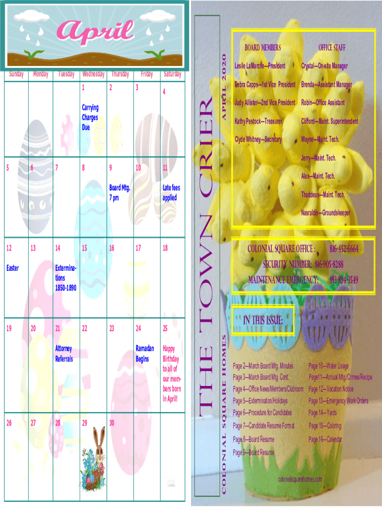 TuesdayWednesday 1Thursday 2Friday 3Saturday 4Carrying Charges Due5678910Board Mtg. 7 pm1213Easter19141516Late fees applied1718Exterminations 1850189020212223Attorney Referrals2611272829302425Ramadan