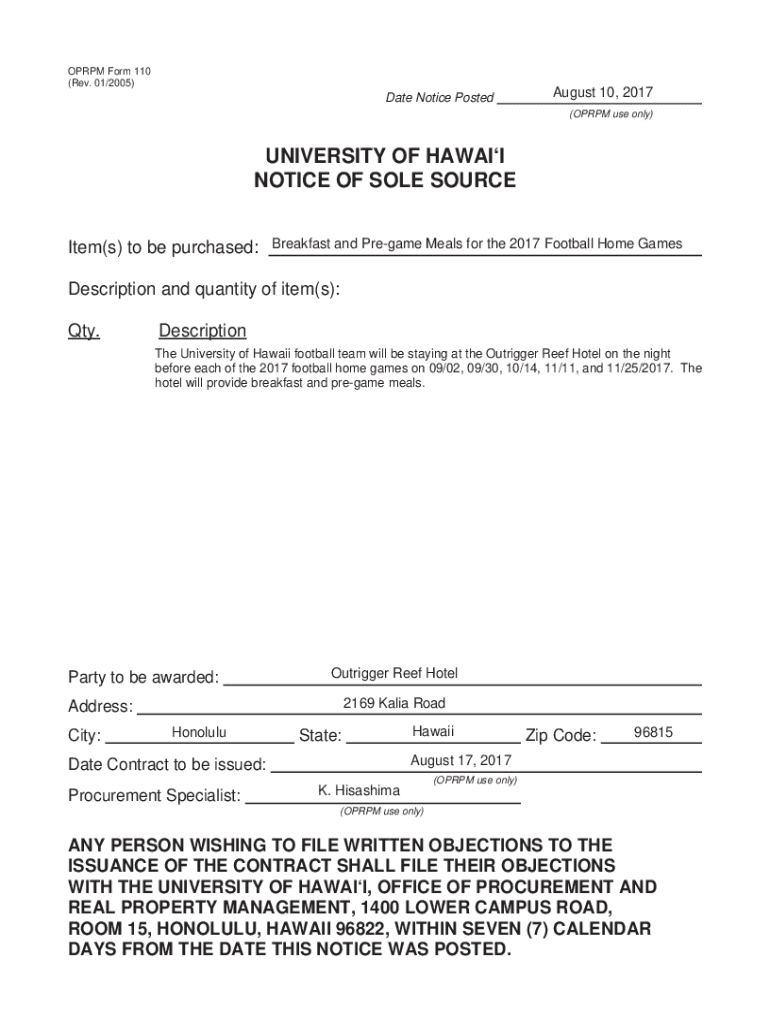OPRPM Form 110 (Rev. 01/2005)Date Notice PostedAugust 10, 2017 (OPRPM use only)UNIVERSITY OF HAWAII NOTICE OF SOLE SOURCE Item(s) to be purchased:Breakfast and Pregame Meals for the 2017 Football