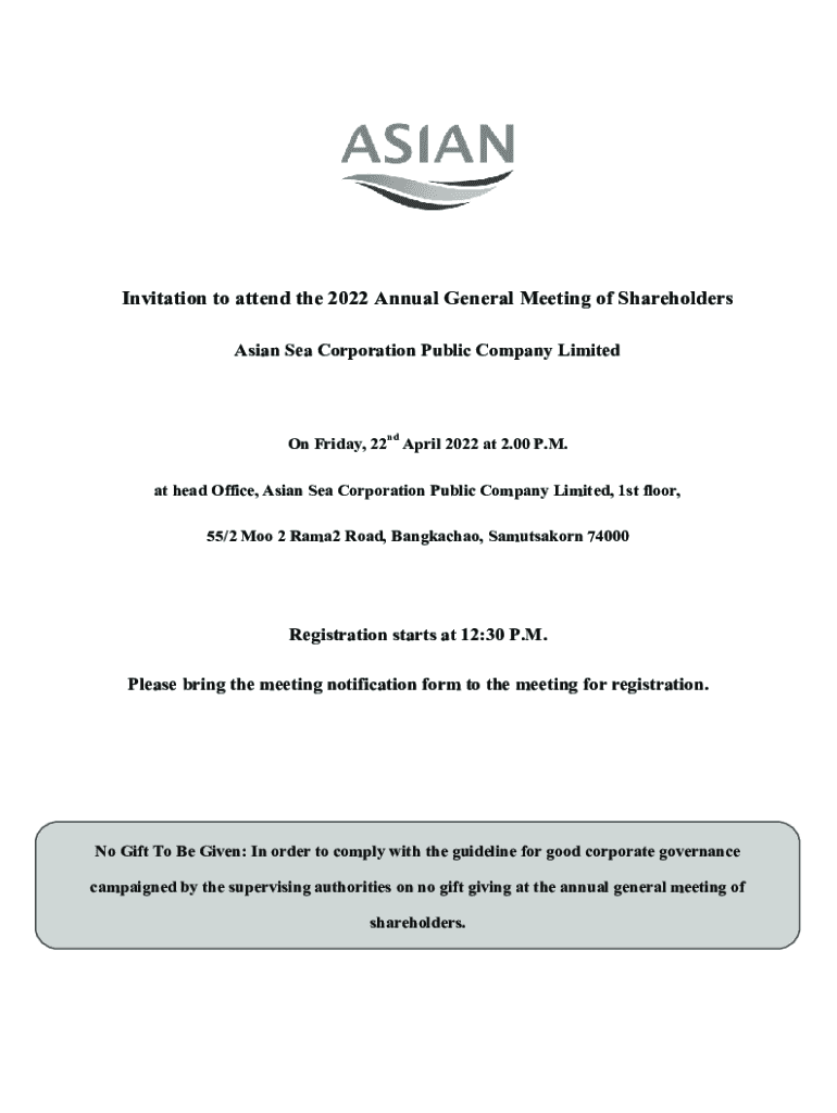 Invitation to attend the 2022 Annual General Meeting of Shareholders Asian Sea Corporation Public Company Limited On Friday, 22nd April 2022 at 2.00 P.M. at head Office, Asian Sea Corporation Public
