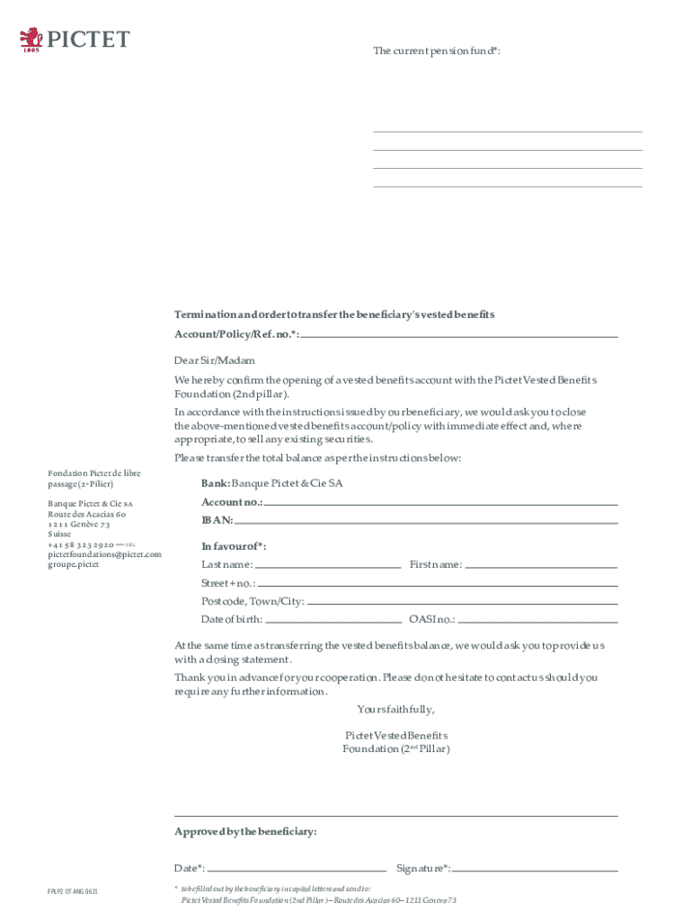 The current pension fund*:Termination and order to transfer the beneficiary\'s vested benefits Account/Policy/Ref. no.*: Dear Sir/Madam We hereby confirm the opening of a vested benefits account with