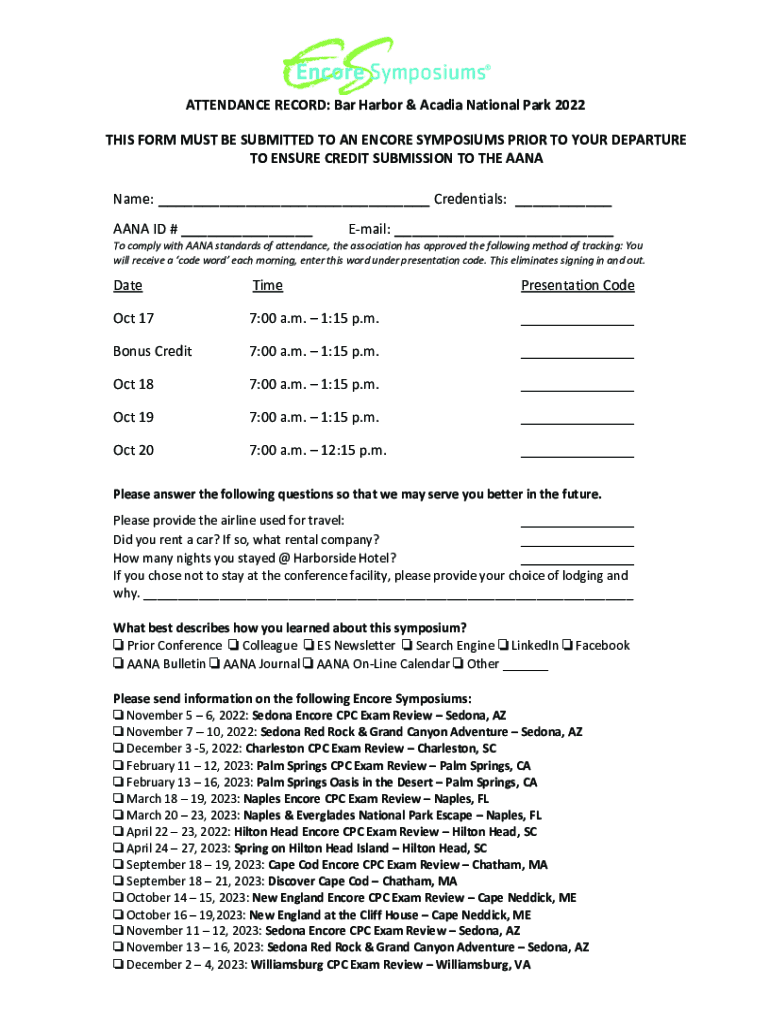 ATTENDANCE RECORD: Bar Harbor & Acadia National Park 2022 THIS FORM MUST BE SUBMITTED TO AN ENCORE SYMPOSIUMS PRIOR TO YOUR DEPARTURE TO ENSURE CREDIT SUBMISSION TO THE AANA Name: ___ Credentials: