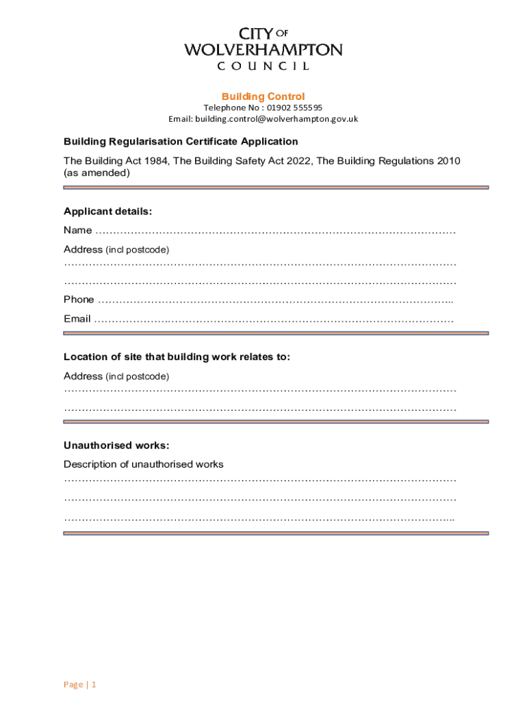 Email: building.control@wolverhampton.gov.ukBuilding Regularisation Certificate Application