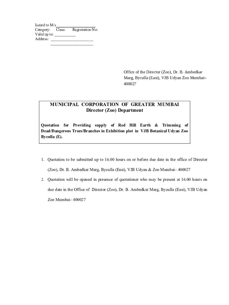 Issued to M/s___ Category: Class: Registration No: Valid up to: ___ Address: ___ ___Office of the Director (Zoo), Dr. B. Ambedkar Marg, Byculla (East), VJB Udyan Zoo Mumbai 400027MUNICIPAL CORPORATION