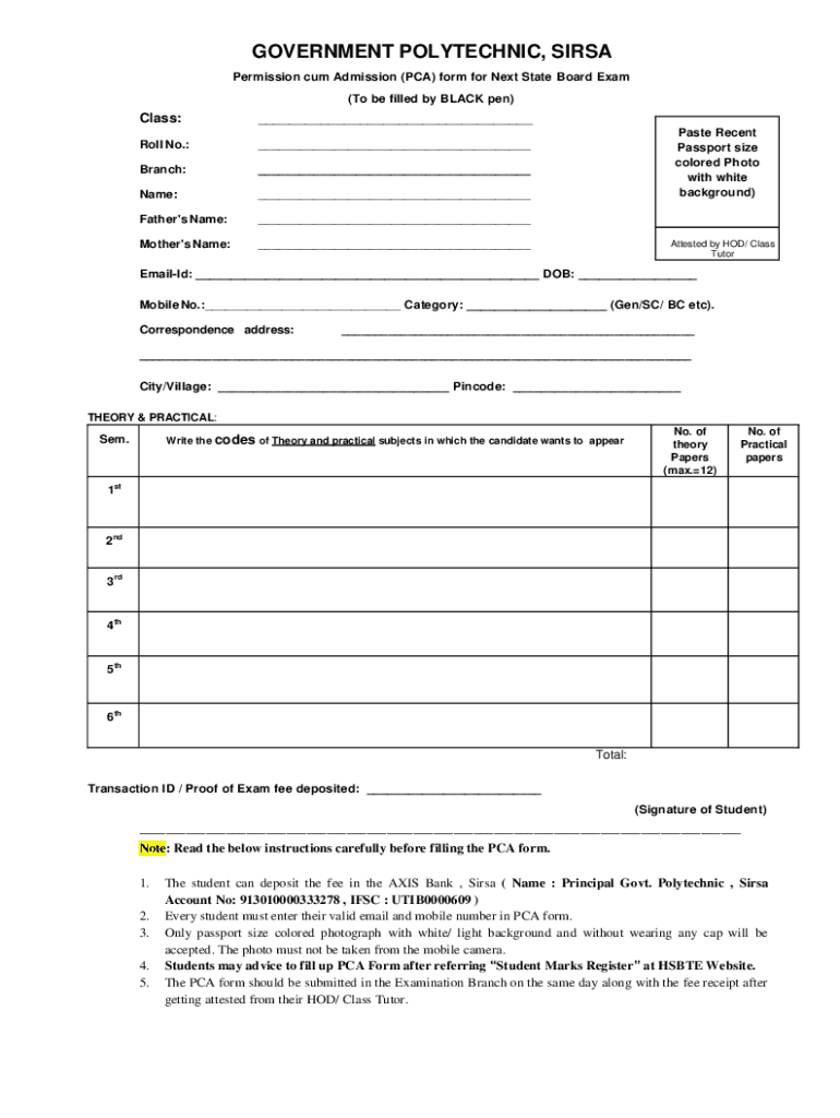 GOVERNMENT POLYTECHNIC, SIRSA Permission cum Admission (PCA) form for Next State Board Exam (To be filled by BLACK pen)Class:___Roll No.:___Branch:___Name:___Father\'s Name:___Mother\'s Name:___Paste