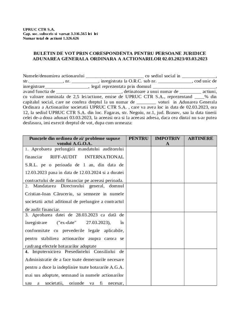 The Buletin de vot prin corespondenta persoana juridica is a document that has to be filled-out and signed for specific needs. Next, it is furnished to the relevant addressee to provide specific info of any kinds. The completion and signing is available or via a suitable service e. g. PDFfiller. These applications help to send in any PDF or Word file online. While doing that, you can customize its appearance for the needs you have and put an official legal e-signature. Once you're good, the user sends the Buletin de vot prin corespondenta persoana juridica to the recipient or several of them by email or fax. PDFfiller is known for a feature and options that make your template printable. It provides different options for printing out appearance. It does no matter how you distribute a form after filling it out - in hard copy or by email - it will always look neat and clear. In order not to create a new editable template from the beginning all the time, make the original form into a template. After that, you will have a rewritable sample.