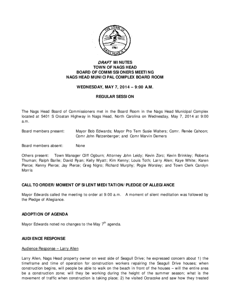 DR AFT MINUTES TOWN OF NAGS HEAD BOARD OF COMMISSIONERS MEETING NAGS HEAD MUNICIPAL COMPLEX BOARD ROOM WEDNESDAY, MAY 7, 2014 9:00 A.M. REGULAR SESSION The Nags Head Board of Commissioners met in