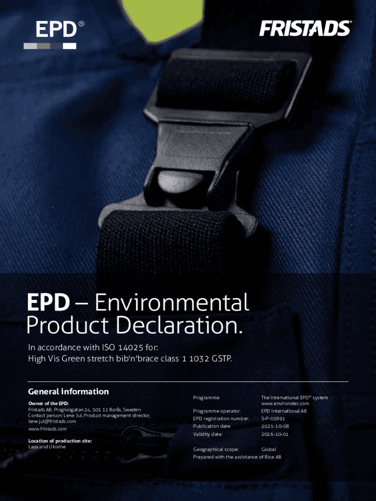 EPD Environmental Product Declaration. In accordance with ISO 14025 for: High Vis Green stretch bib\'n\'brace class 1 1032 GSTP.General information Owner of the EPD: Fristads AB, Prognosgatan 24,