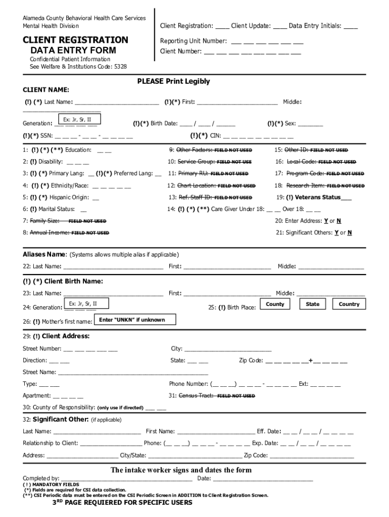 Alameda County Behavioral Health Care Services Mental Health DivisionCLIENT REGISTRATION DATA ENTRY FORMClient Registration: ___ Client Update: ___ Data Entry Initials: ___ Reporting Unit Number: