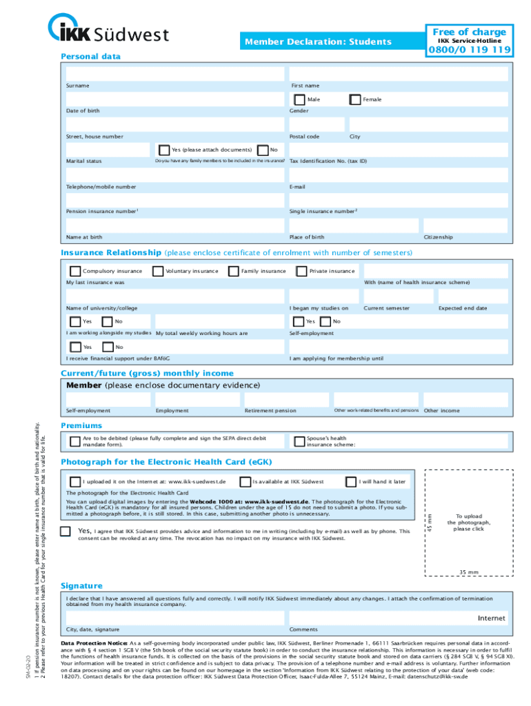 SdwestMember Declaration: StudentsPersonal dataSurnameFree of charge IKK ServiceHotline0800/0 119 119First name MaleDate of birthGenderStreet, house numberPostal code Yes (please attach documents)Marital