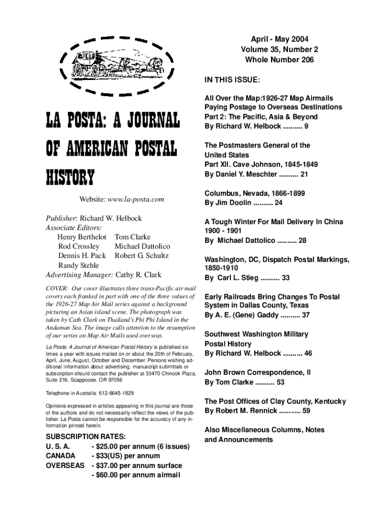 La PostaMay 20041 April May 2004 Volume 35, Number 2 Whole Number 206IN THIS ISSUE:LA POSTA: A JOURNAL OF AMERICAN POSTAL HISTORY Website: www.laposta.com Publisher: Richard W. Helbock Associate Editors: