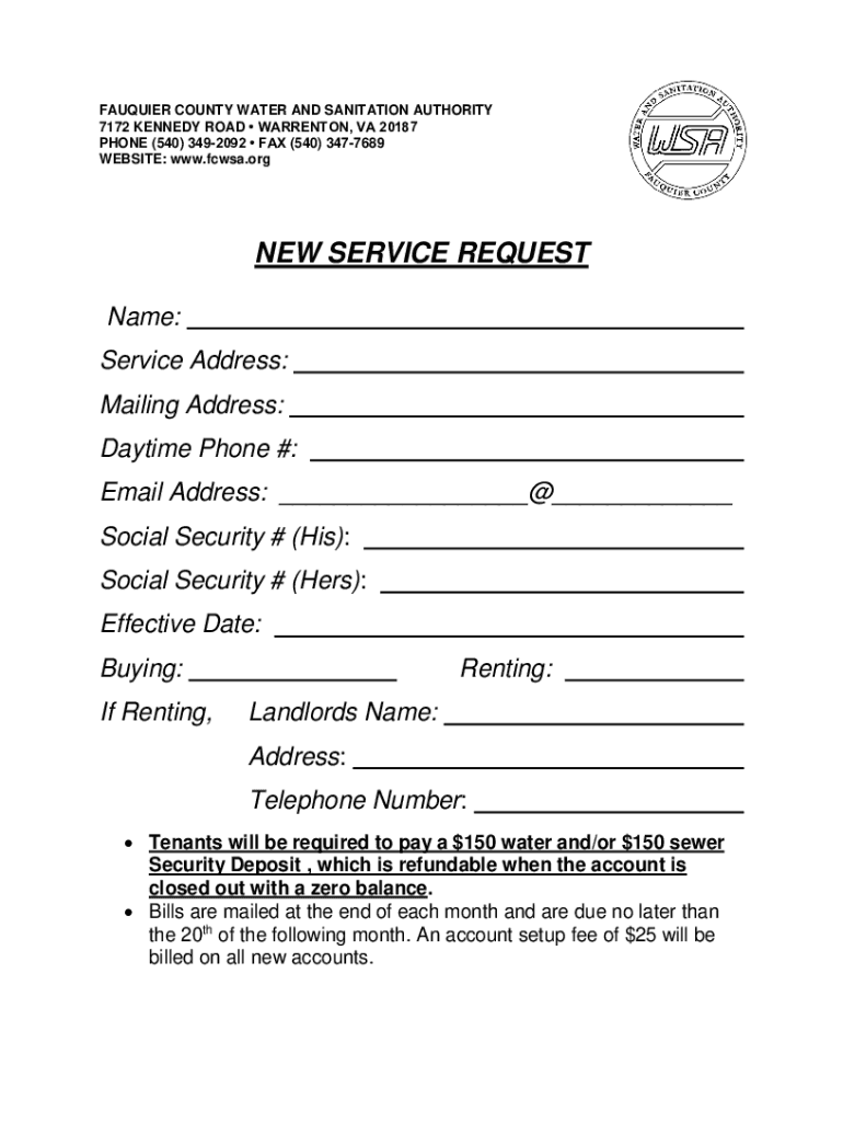 FAUQUIER COUNTY WATER AND SANITATION AUTHORITY 7172 KENNEDY ROAD WARRENTON, VA 20187 PHONE (540) 3492092 FAX (540) 3477689 WEBSITE: www.fcwsa.orgNEW SERVICE REQUEST Name: Service Address: Mailing