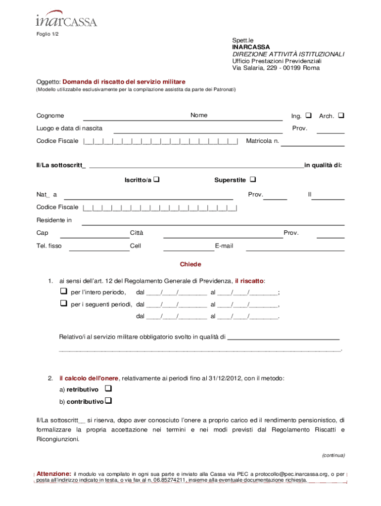 Foglio 1/2Spett.le INARCASSA DIREZIONE ATTIVIT ISTITUZIONALI Ufficio Prestazioni Previdenziali Via Salaria, 229 00199 Roma Oggetto: Domanda di riscatto del servizio militare (Modello utilizzabile