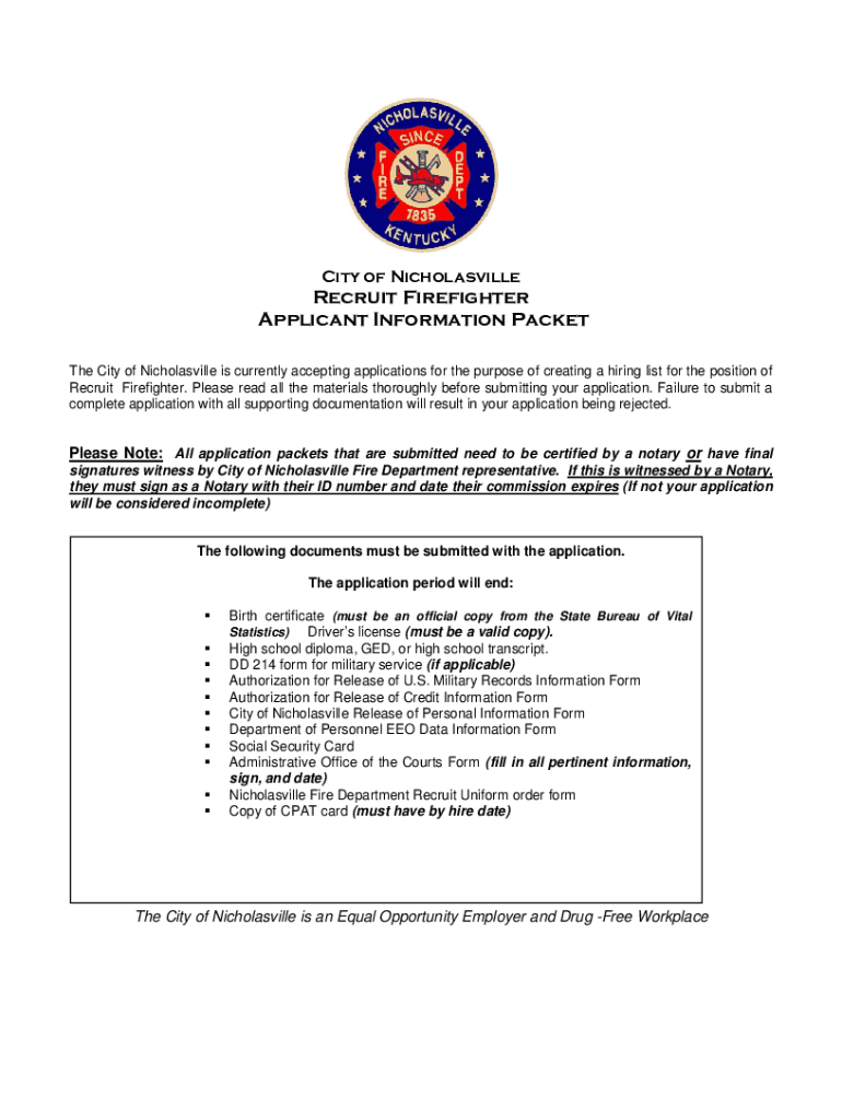 City of NicholasvilleRecruit Firefighter Applicant Information Packet The City of Nicholasville is currently accepting applications for the purpose of creating a hiring list for the position of Recruit