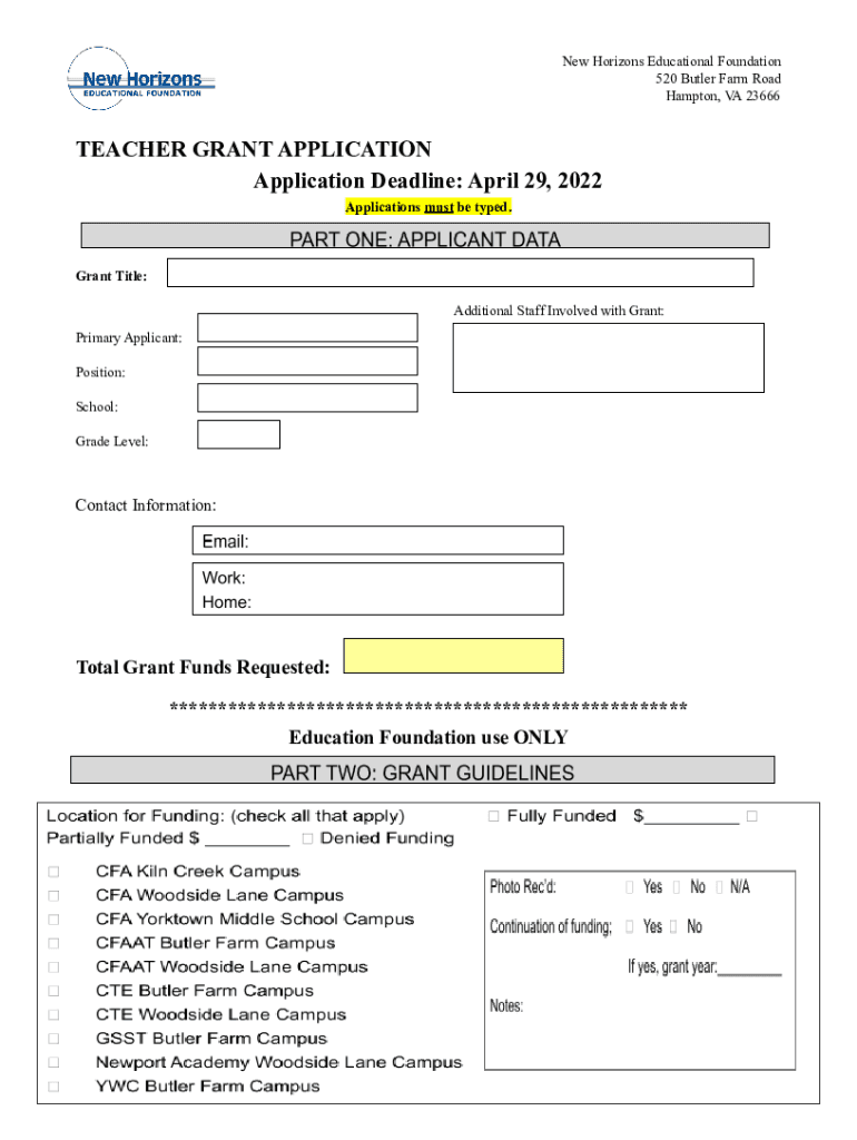 New Horizons Educational Foundation 520 Butler Farm Road Hampton, VA 23666TEACHER GRANT APPLICATION Application Deadline: April 29, 2022 Applications must be typed.Grant Title: Additional Staff Involved