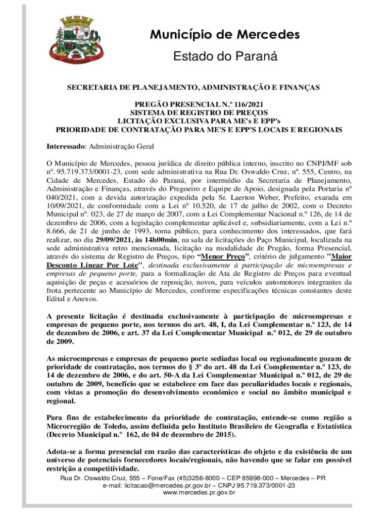 Municpio de Mercedes Estado do Paran SECRETARIA DE PLANEJAMENTO, ADMINISTRAO E FINANAS PREGO PRESENCIAL N. 116/2021 SISTEMA DE REGISTRO DE PREOS LICITAO EXCLUSIVA PARA ME\'s E EPP\'s PRIORIDADE DE