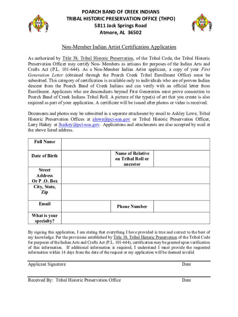 POARCH BAND OF CREEK INDIANS TRIBAL HISTORIC PRESERVATION OFFICE (THPO) 5811 Jack Springs Road Atmore, AL 36502 NonMember Indian Artist Certification Application As authorized by Title 39, Tribal