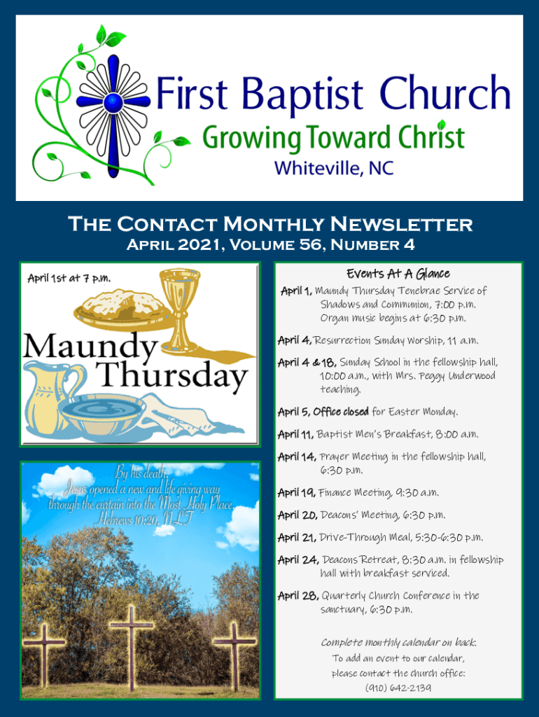 The Contact Monthly Newsletter April 2021, Volume 56, Number 4 April 1st at 7 p.m.Events At A Glance April 1, Maundy Thursday Tenebrae Service of Shadows and Communion, 7:00 p.m. Organ music begins