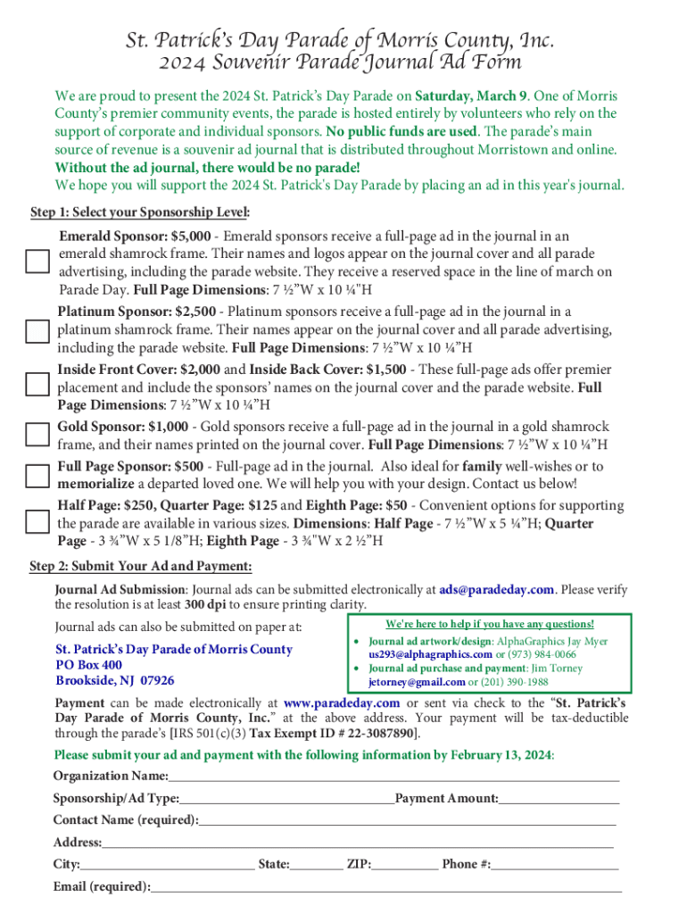 St. Patricks Day Parade of Morris County, Inc. 2024 Souvenir Parade Journal Ad Form We are proud to present the 2024 St. Patricks Day Parade on Saturday, March 9. One of Morris Countys premier community