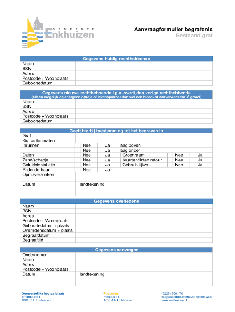 Aanvraagformulier begrafenis Bestaand grafGegevens huidig rechthebbende Naam BSN Adres Postcode + Woonplaats Geboortedatum Gegevens nieuwe rechthebbende i.g.v. overlijden vorige rechthebbende e(alleen