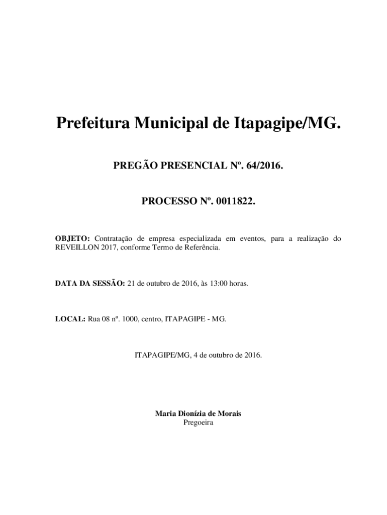 Prefeitura Municipal de Itapagipe/MG. PREGO PRESENCIAL N. 64/2016.PROCESSO N. 0011822.OBJETO: Contratao de empresa especializada em eventos, para a realizao do REVEILLON 2017, conforme Termo de Referncia.DATA